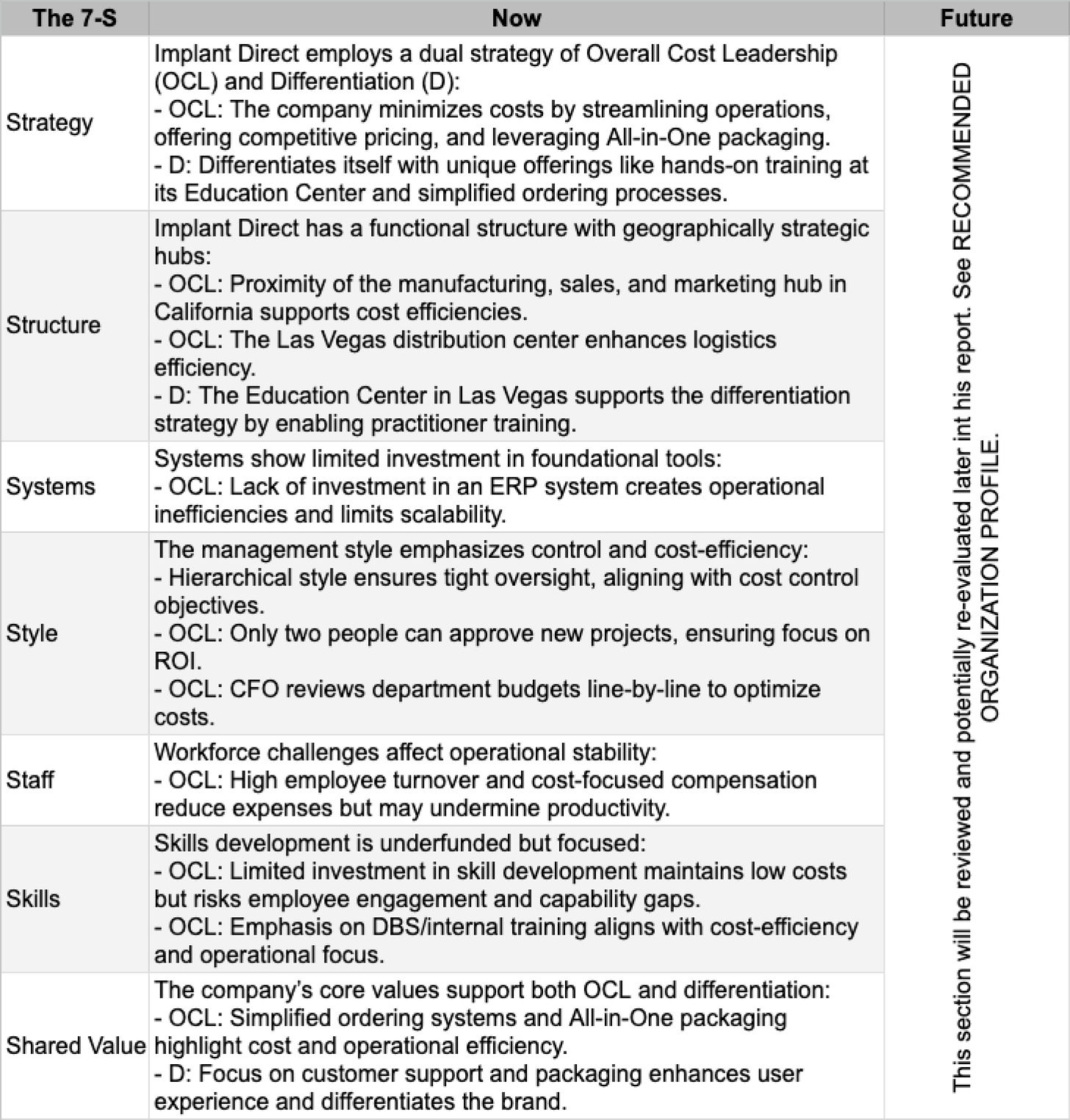 In summary, to attain competitive advantage, the integration of Implant Direct’s 7-S framework reflects a disciplined approach to achieving cost leadership while providing opportunities to build on its innovative foundations. By aligning operational practices with its aspirational goals, Implant Direct is well-positioned to sustain its competitive advantage and deliver greater value to customers.